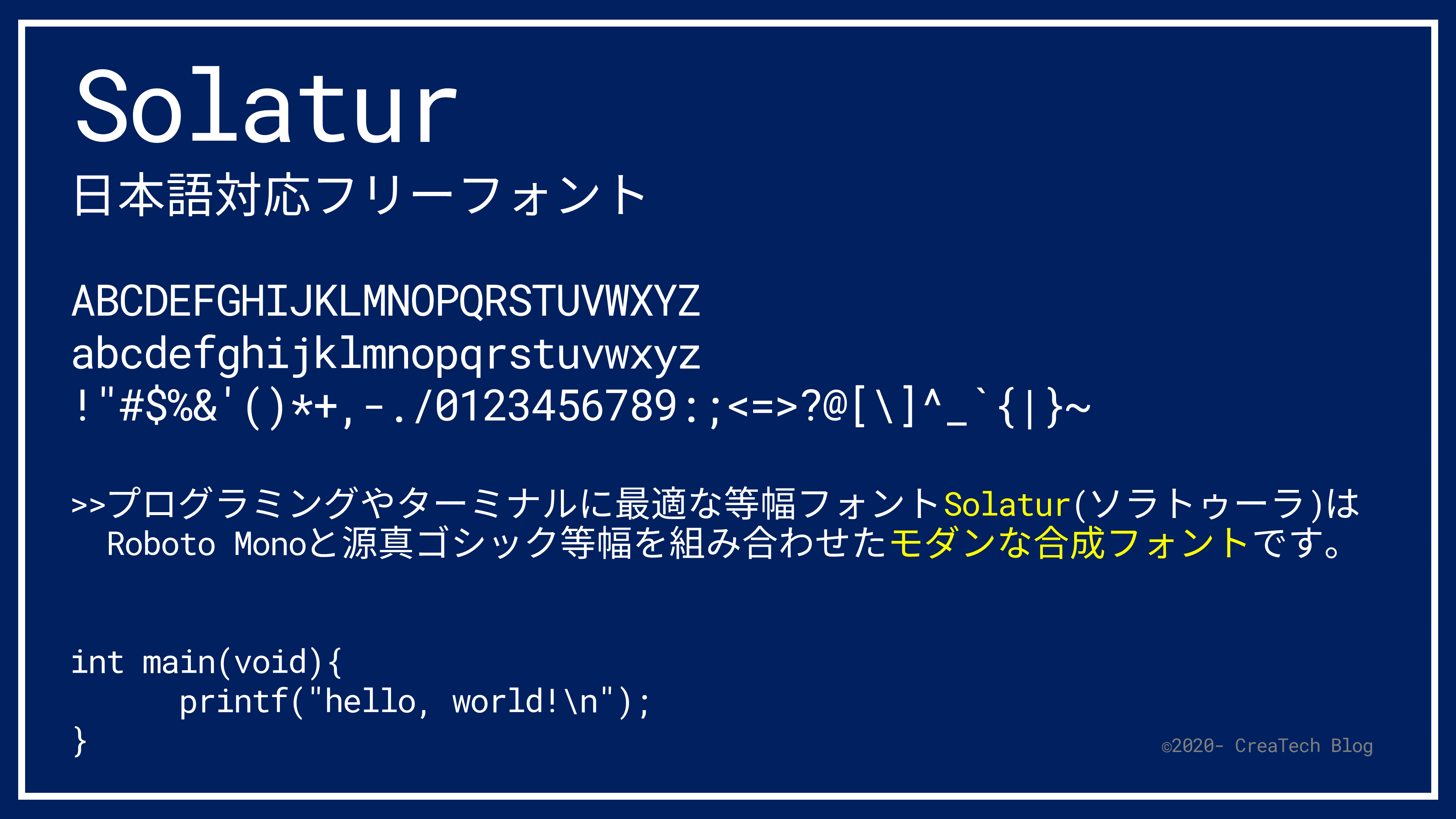 Solatur(ラテン: Console)は,Roboto Monoと自家製フォント工房様による源ノ角ゴシック由来のフリーフォント,源真ゴシック等幅を組み合わせてサイズや文字幅等を調整した合成フォントです。
