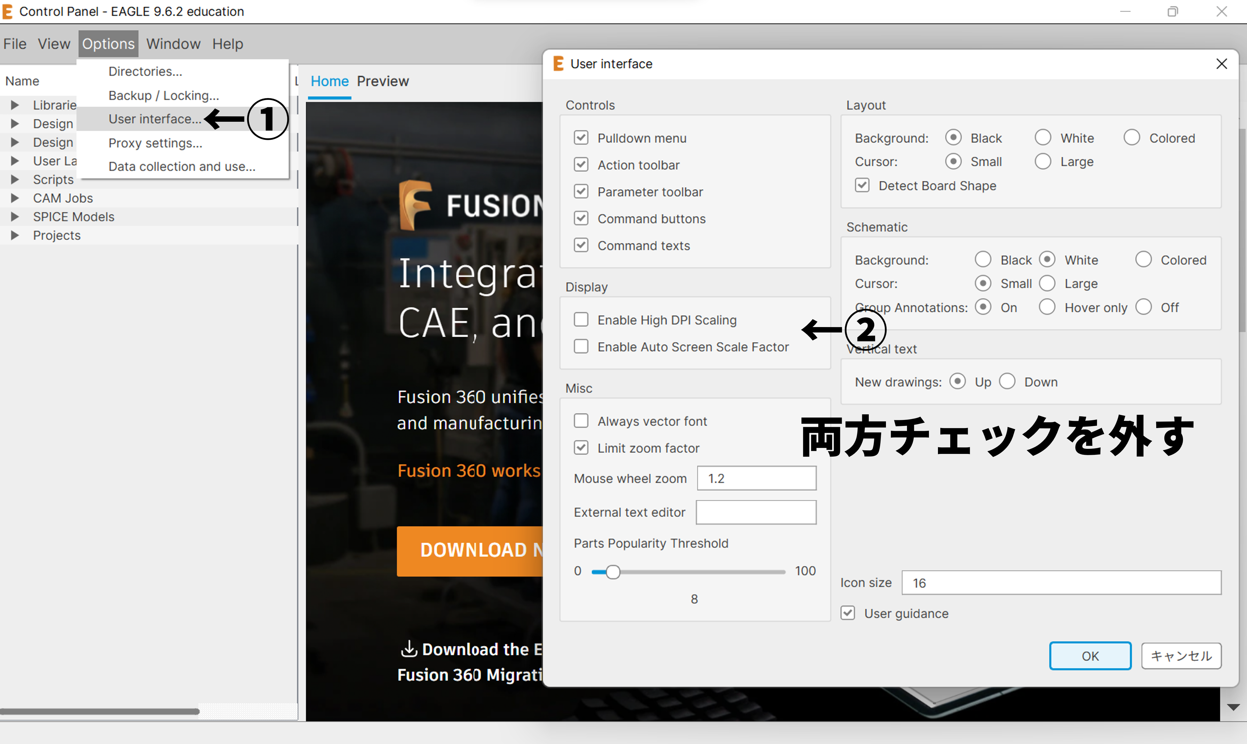 解像度が高いパソコンを使用しているとき,Windows側で表示倍率をスケーリングしていることがあります。EAGLEではここ周りの処理に不具合が残っており,普通に起動するだけではおかしな表示になってしまいます。
